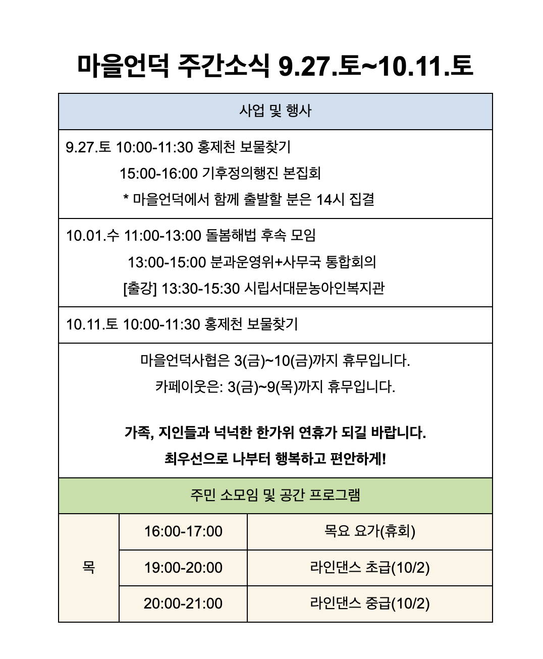 9월 26일 마을언덕사협 주간 소식