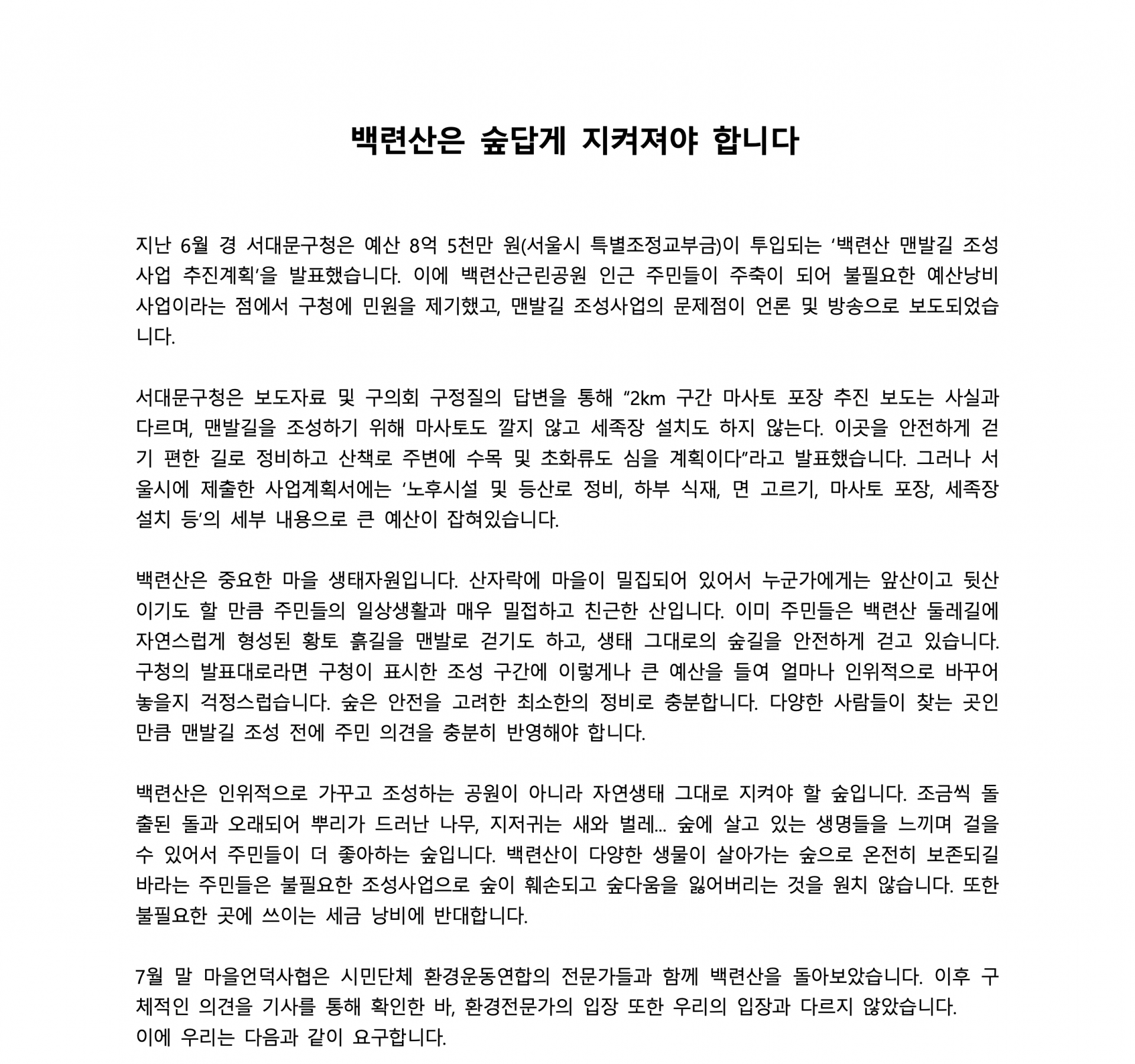 서대문구청의 <백련산 맨발길 조성사업 추진계획>이 발표되면서 불필요한 예산 집행은 아닐지, 숲생태계에 미칠 영향은 얼만큼일지 주민들은 걱정이 앞섭니다. 이에 주민들은 아래와 같은 입장문을 내고 서대문구의 책임 있는 조치를 촉구합니다.